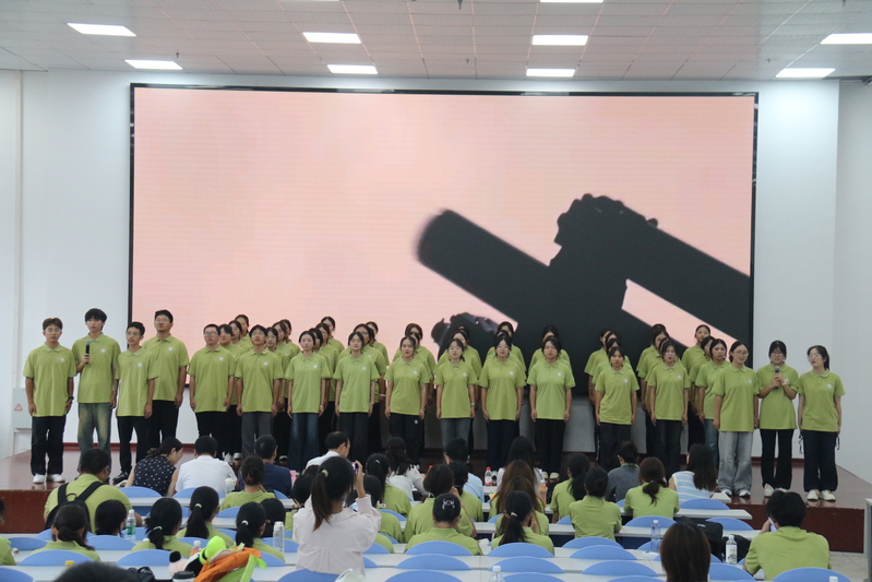 典礼未启,韵已先声。2025级新生身着整齐着装,以一曲《勋章》唱响开场——“生命只能向前,坚定信念的人都是英雄”,清亮的歌声里满是青年学子的昂扬锐气,写下了新生们对大学生活的憧憬与对理想的向往。