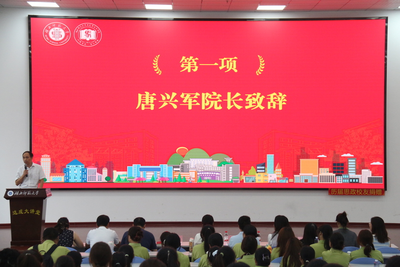 典礼伊始,唐兴军院长上台致辞,向全体2025级新生致以热烈欢迎。他循着学院发展的时间脉络,回顾了马院在学科建设、人才培养、思政教育等领域的耕耘与收获,阐释了学院的育人理念,并围绕“如何度过有意义的大学生活”向新生们提出四点期望:一要坚定理想信念,筑牢心中有光的信仰之基;二要锤炼专业本领,做到有思想、讲政治、爱教育;三要知行合一,勇担胸中有家国的时代使命;四要携手共进,共育心中有爱的人生境界,为新生们指点了前行方向。