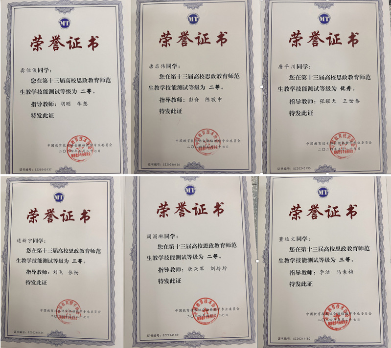 赛前,我院高度重视本次大赛,积极部署备赛,通过初赛和复赛两轮的严格选拔,推选出华文杯参赛选手,最终确定唐启伟、龚佳俊、逯新宇、唐平川4名本科生和周湄琳、董延文2名课程教学论硕士研究生参赛,并为6名参赛选手分配经验丰富的指导教师。yl23455永利官网参赛选手在指导教师的精心指导下认真磨课、备赛,经过激烈的角逐,最终在比赛中斩获佳绩。其中,选手唐启伟和龚佳俊获本科生组二等奖,逯新宇获本科生组三等奖,唐平川获本科生组优秀奖;研究生组中周湄琳获得二等奖,董延文获得三等奖,在全国众多选手前展示了马院学子的综合素养,体现了学院在师范生基本功训练和教学专业技能培养方面的实力。