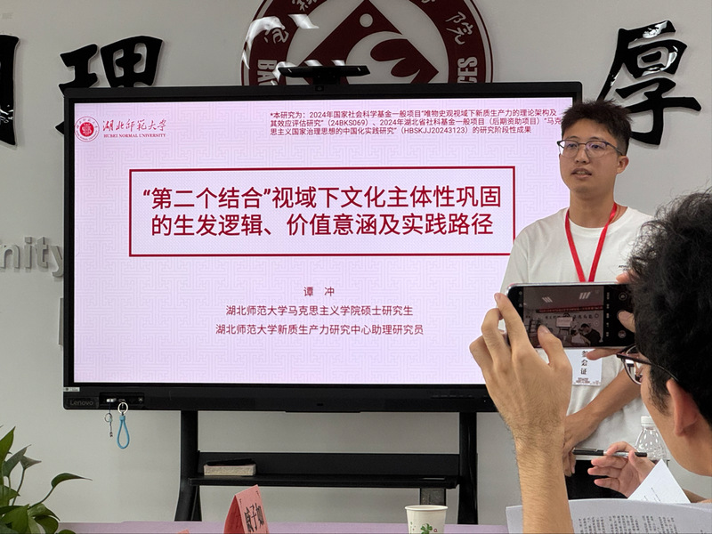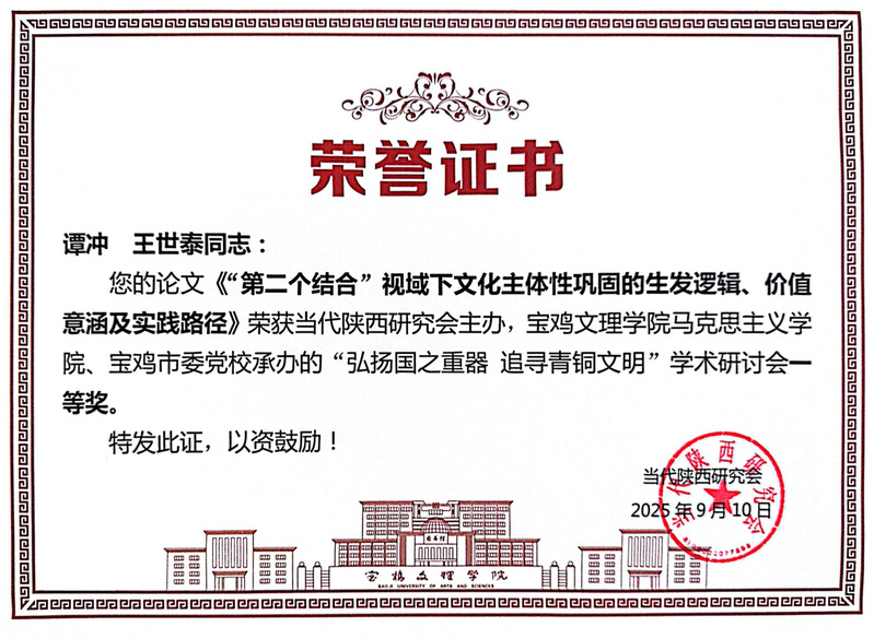 yl23455永利官网24级硕士研究生谭冲和王世泰博士共同撰写的《“第二个结合”视域下文化主体性巩固的生发逻辑、价值意涵及实践路径》入选本次学术研讨会,并在论文评选中荣获一等奖的佳绩,谭冲应邀参加此次学术研讨会。