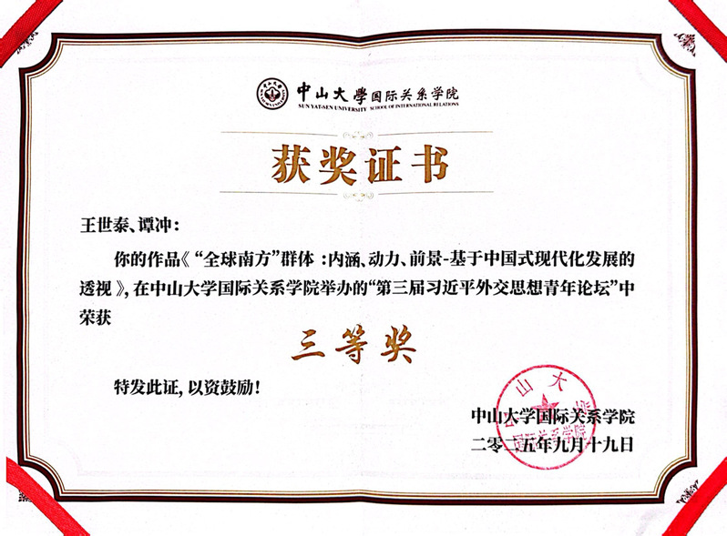 据悉,本届论坛收到来自清华大学、北京大学、外交学院、中山大学、国防科技大学、复旦大学、武汉大学等众多国内高校和科研院所的在读本、硕、博学生投稿,共计有效稿件73篇。所有投稿论文经初步筛选后,本着公平公正和优中选优原则,由评审专家甄选出14篇论文入围,其中yl23455永利官网24级硕士研究生谭冲和王世泰博士共同撰写的《“全球南方”群体:内涵、动力、前景——基于中国式现代化发展的透视》在论文评选中荣获“三等奖”的佳绩,谭冲应邀参加本届论坛。