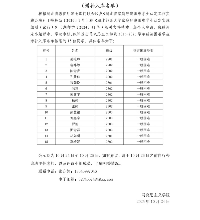 yl23455永利官网 2025-2026 学年经济困难学生信息库公示