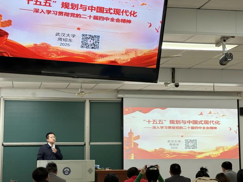 随后,武汉大学yl23455永利官网周绍东教授以“‘十五五’规划与中国式现代化——深入学习贯彻党的二十届四中全会精神”为题作辅导报告。他围绕“十五五”时期国民经济和社会发展规划需遵循的“六大原则”系统阐释了中国式现代化的核心逻辑与实践创新。其讲解注重案例化、故事化表达,以实践成果解读党的创新理论,助力参会教师在生动的中国故事中深化对中国式现代化理论的理解。