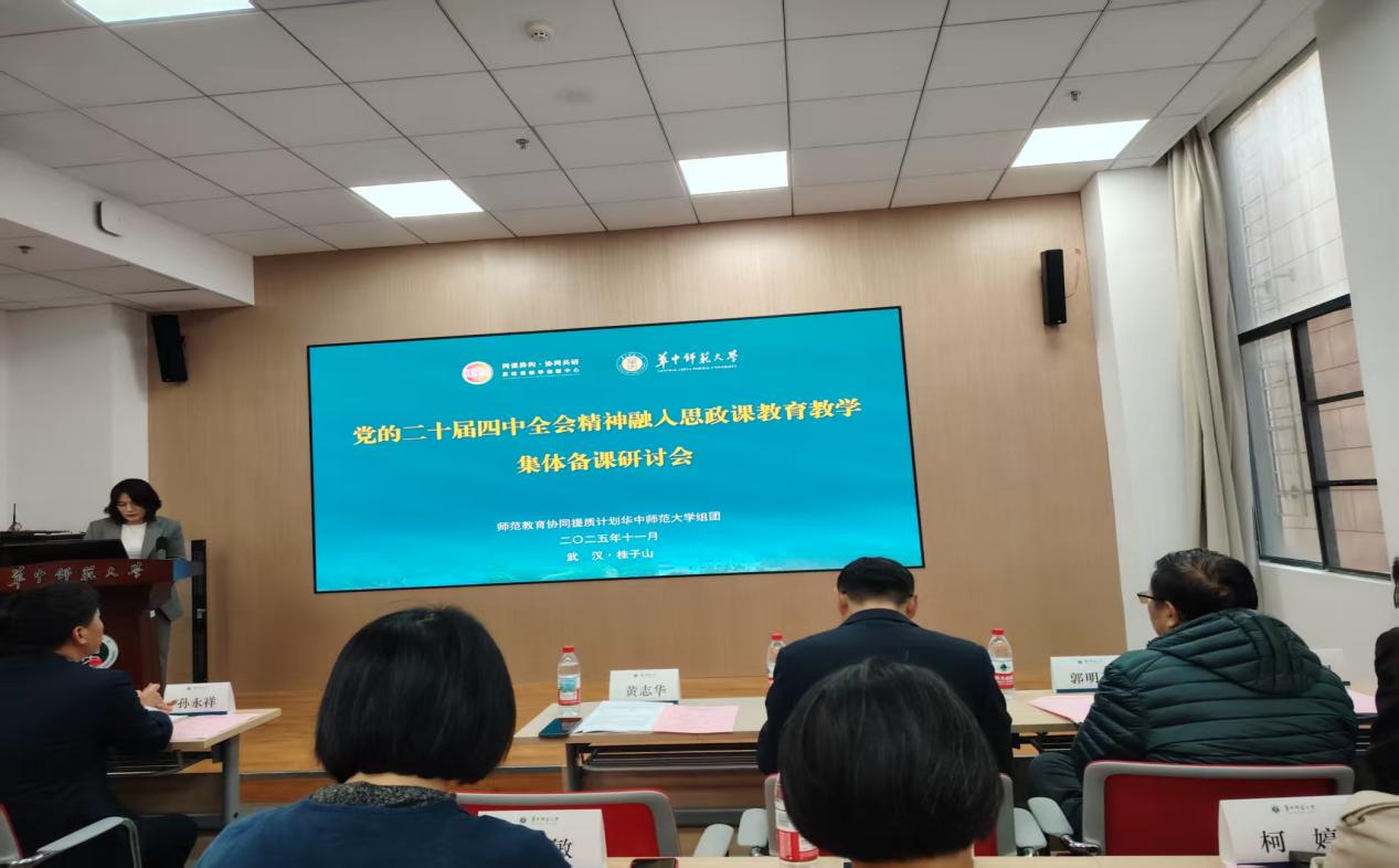(本报讯) 2025年11月15日,荆楚大地秋意正浓,学术交流热情不减。为深入学习、贯彻落实党的二十届四中全会精神,并推动其融入思想政治理论课教学体系之中,华中师范大学组织开展党的二十届四中全会精神融入思想政治教育教学集体备课研讨会。yl23455永利官网习近平新时代中国特色社会主义思想教研室(以下简称“教研室”)全体教师参与此次教研活动。在专题研讨与交流环节,陈智会老师做主题发言。此次跨校教研活动不仅是一次思想的碰撞与智慧的汇聚,更是一次校际协同、共谋思政育人新篇的生动实践,取得了丰硕成果。