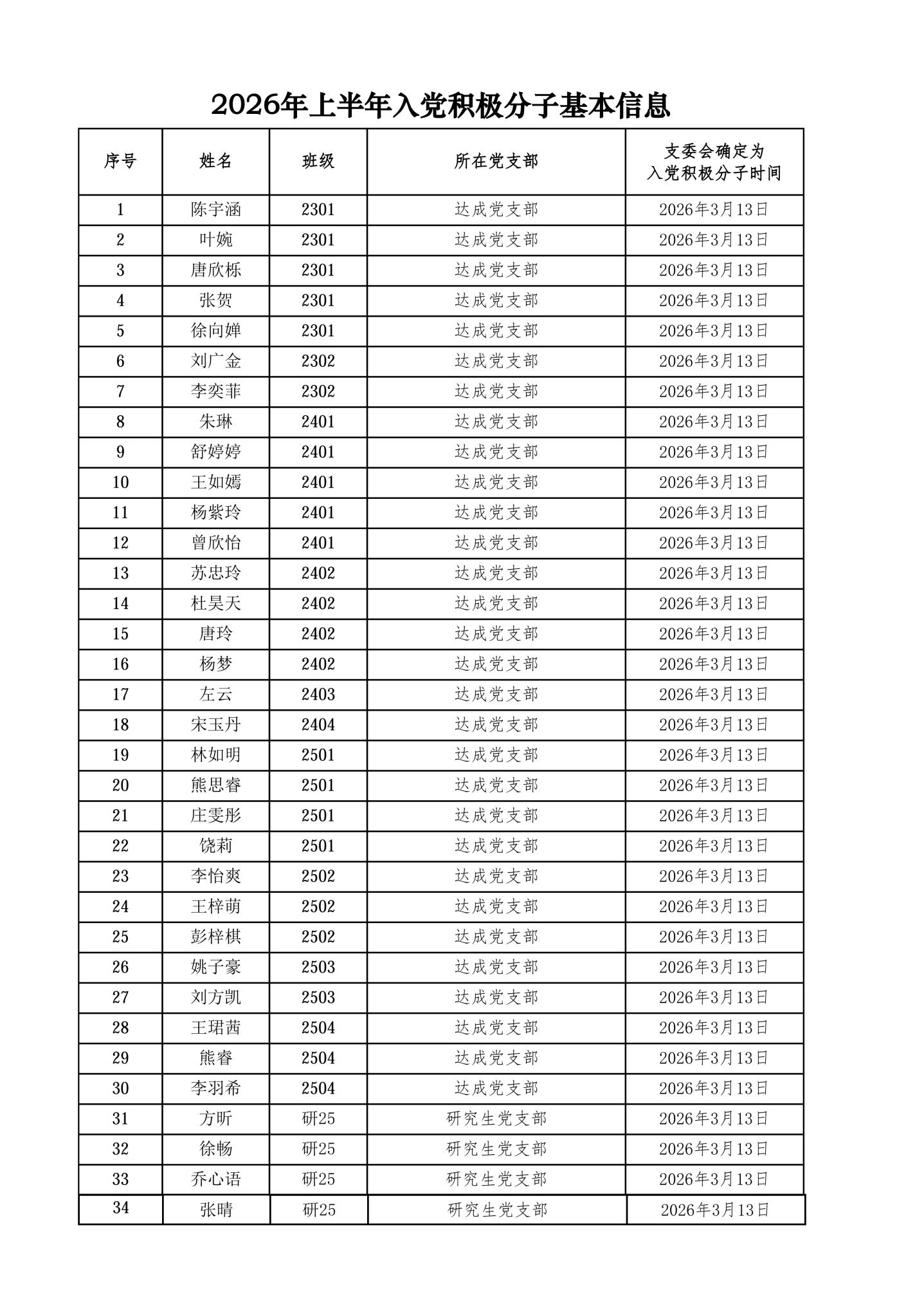 根据《中国共产党发展党员工作细则》、《中共yl23455永利官网委员会发展党员工作实施细则》以及2026年上半年入党积极分子发展工作有关要求,经本人申请、群团组织推优,学生党支部委员会讨论研究,拟确定以下34名同志为入党积极分子,现将名单予以公示。