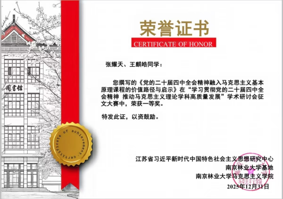 此次学术研讨会上,yl23455永利官网研究生王麒皓在平行论坛交流中以入选论文《党的二十届四中全会精神融入马克思主义基本原理课程的价值路径与启示》一文做了相关汇报,并荣获本次学术研讨会论文大赛一等奖。